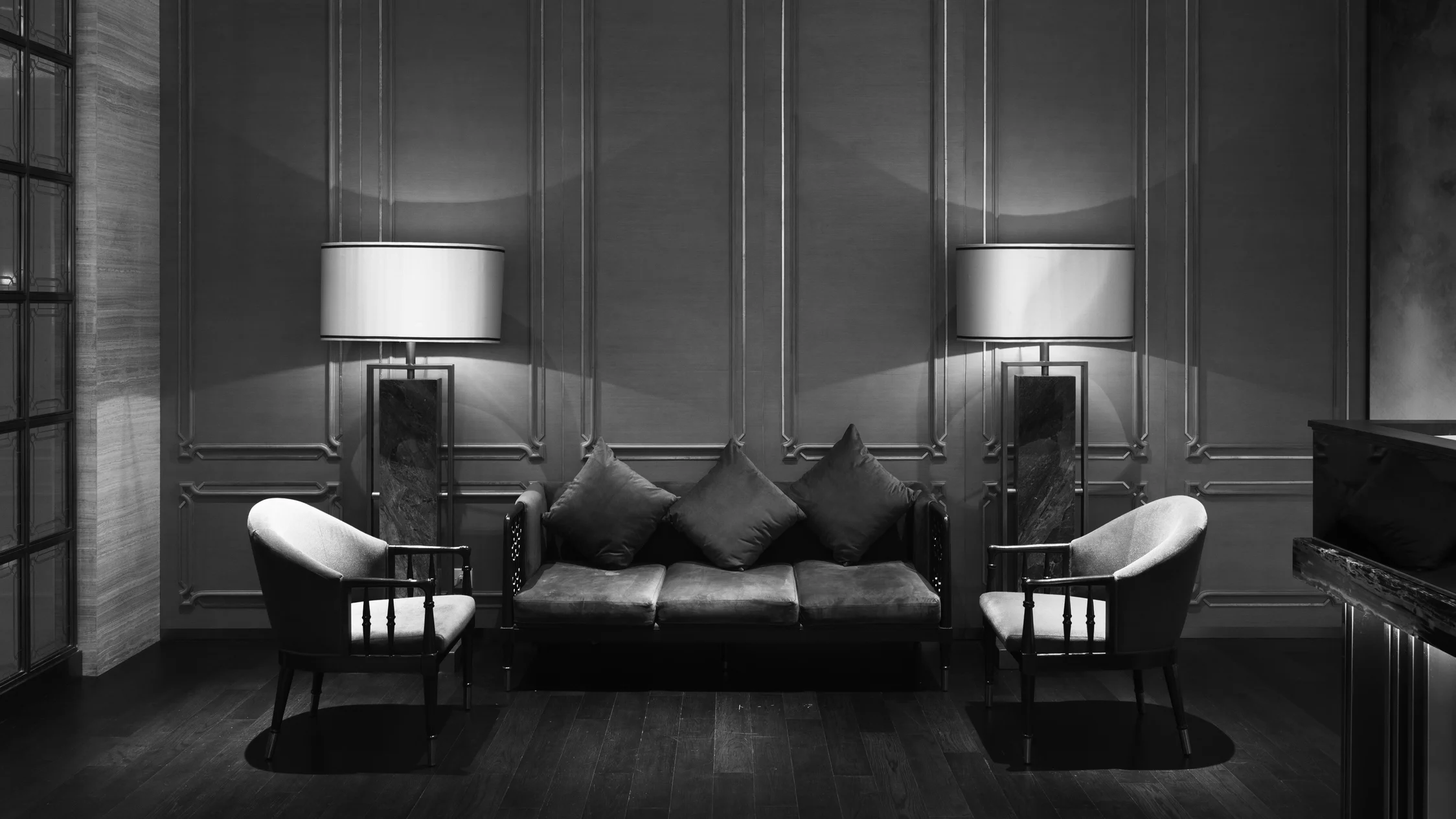 The interior finishes are chosen to complement the architectural space and to preserve its inherent qualities. Playing with contrast and texture, the meticulously selected materials are combined so as to emphasise their essence: dark timber panels meet pearl raw silk cushions, hammered bronze is set off by the softness of a wool carpet, rough linen is juxtaposed with smooth leather. Possessing their own timeless elegance, the materials are harmoniously arranged to create a relaxed yet sophisticated environment of a true urban retreat.